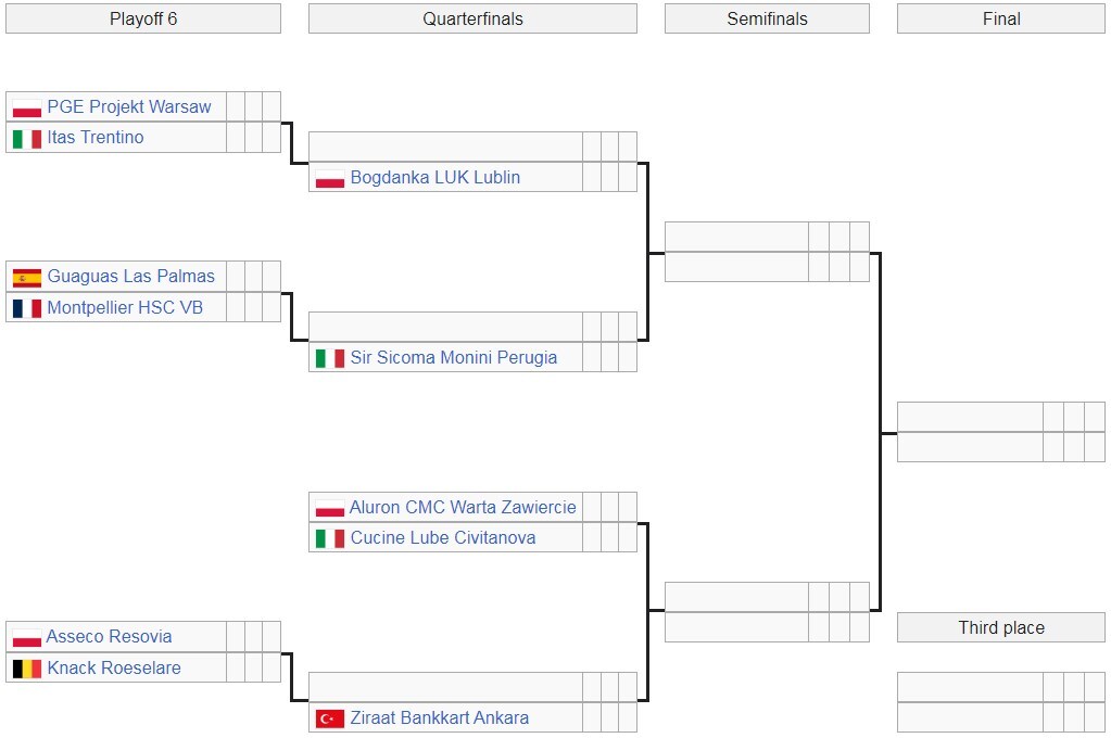 В первом раунде плей-офф «Варшава» сыграет с «Трентино», «Гуагуас» – с «Монпелье», «Ресовия» – с «Кнаком». Мы уже знаем и одну четвертьфинальную пару: «Заверце» – «Чивитанова».