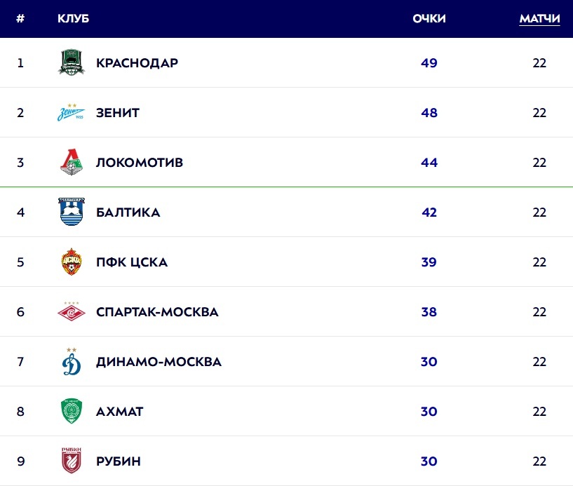 У казанской команды 30 очков – столько же у «Ахмата» и московского «Динамо». А вот отрыв от шестого места достаточно большой: у «Спартака» – 38 очков. Равно как и отрыв от десятого места: у «Акрона» – 22 балла.