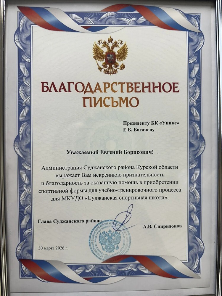 Спиридонов вручил благодарственное письмо Евгению Богачеву. К слову, президент УНИКСа родился и вырос в Суджанском районе.