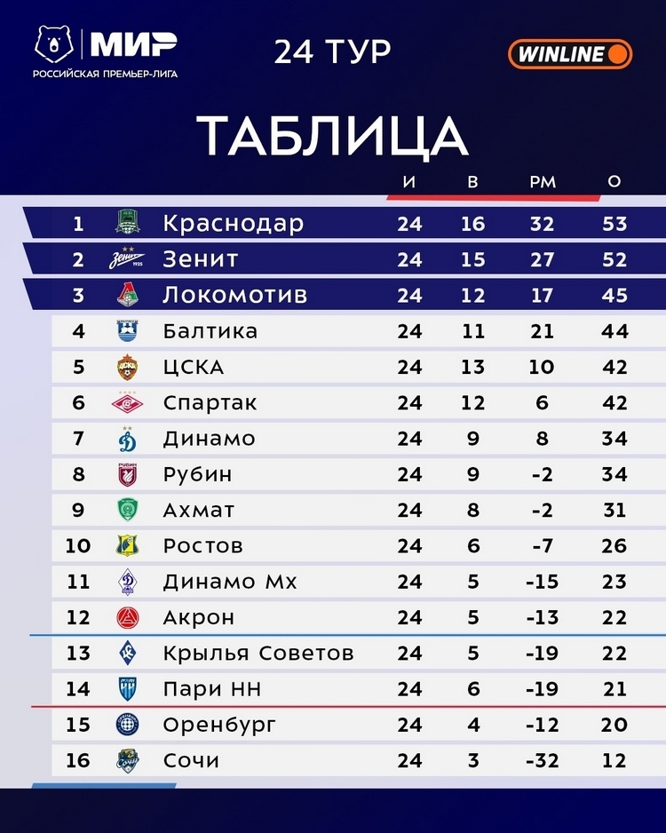 В зоне прямого вылета «Сочи» (12 очков) и «Оренбург» (20), а «Нижний Новгород» и «Крылья Советов» в зоне стыковых игр. Отметим, что от спасительной зоны (12-е место) «Оренбург» отделяет два очка.