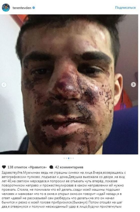 «Здравствуйте. Мужчинам ведь не страшны синяки на лице. Вчера, возвращаясь с автограф-сессии в «Пулково», подъехал к дому. Девушка выезжала со двора, на вид лет 40, на светлом «Мерседесе». Я попросил её отъехать чуть вперёд, показав поворотником направо и прожестикулировав, в каком направлении ей нужно проехать. Стояла, не понимала, что ей делать… Сзади моей машины подошёл человек и маяковал что-то в окне. Я открыл окно. Он говорит: «Сдай назад», я в ответ: «Давай не рассказывай. Сам разберусь, что делать». На это он начал бычиться и резко к моей голове приблизился. Потом отошёл на шаг-два, я отвернулся и получил неожиданный удар в лицо, будучи пристегнутым.
