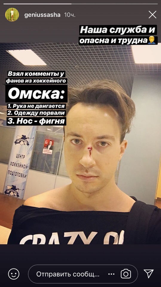 Корреспондент Sports.ru Александр Головин накануне был избит фанатами омского «Авангарда». Об этом в своем инстаграме сообщил сам журналист.