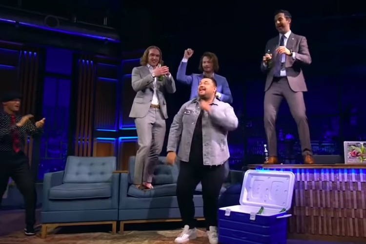 Ургант предложил хоккеистам воссоздать чемпионский парад. В студию вынесли мини-холодильник с пивом, а в роли катера выступили диван и стол ведущего.