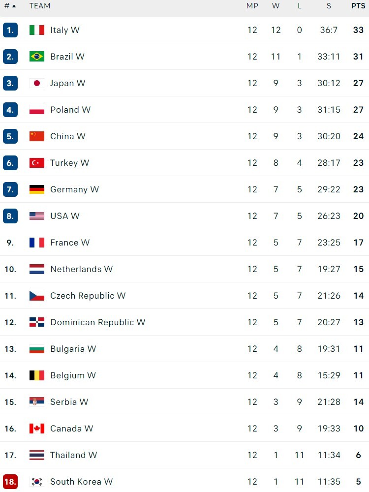 Семь побед стали минимальной планкой для прохода в «Финал восьми». Столько у команд Германии и США. Корея одержала лишь одну победу в 12 матчах при пяти набранных очках и заняла последнее место в турнирной таблице – команда покинет турнир. Её место займёт лучшая команда мирового рейтинга, которой в этом сезоне не было в числе участников Лиги наций.