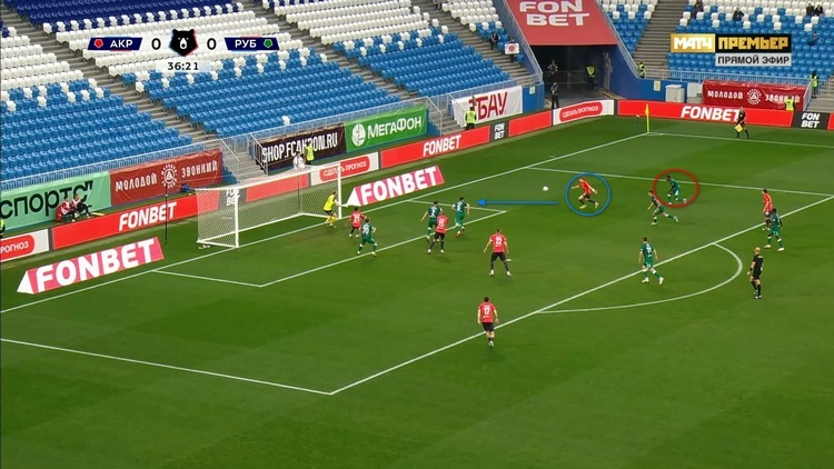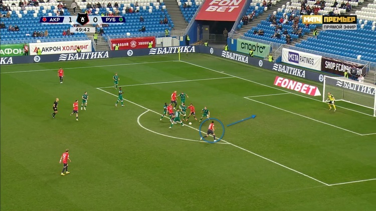 Первый пропущенный гол можно смело повесить на Арройо. Началось все с потери Иву в центре поля. Полузащитник зачем-то пошел в дриблинг, игроки «Акрона» отобрали мяч и он оказался у Дмитрия Пестрякова. Молодой игрок быстро перевел его на другой фланг, а сам снова вернулся на свою позицию (правый фланг обороны), трусцой начал двигаться в штрафную площадь казанцев, снова получил мяч на фланге, стоя в гордом одиночестве. С ним сблизился Андерсон, но Дмитрий решил отдать пас на Севикяна. От армянина последовал навес, а Пестряков все это время двигался в штрафную площадь, находясь за спиной Арройо. После навеса Егор Тесленко снял мяч, но он остался в штрафной ничейным, его подобрал, как раз Пестряков и точно пробил. Арройо же оставалось просто наблюдать за эпизодом.