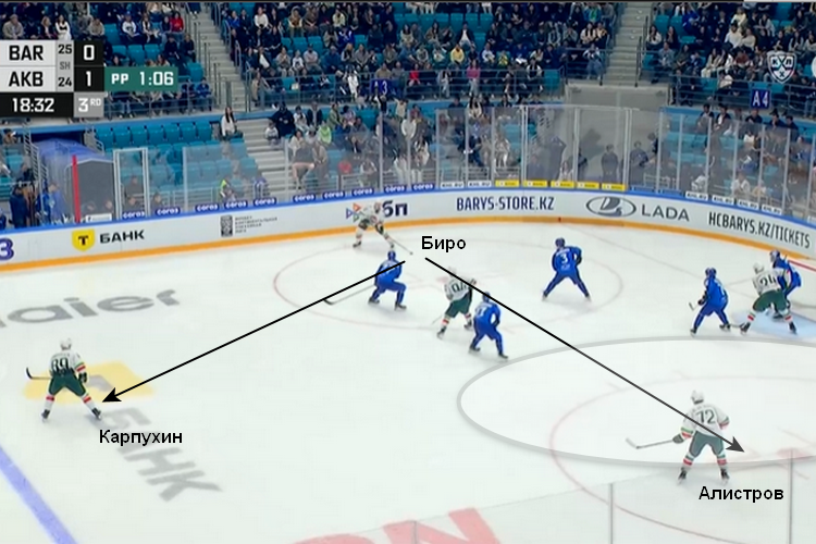 Другой момент: с шайбой Биро, у которого два варианта. Сложный – диагональ на Владимира Алистрова и простой – пас защитнику Илье Карпухину. Канадец снова выбирает то, что попроще – атака ничем не завершается.