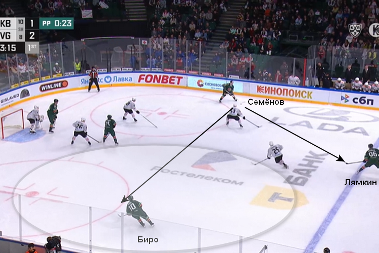 Вот ещё пара таких же моментов. На льду вторая спецбригада, с шайбой форвард Кирилл Семёнов. У игрока есть вариант отдать диагональ на Биро, который стоит в одиночестве, либо скинуть на защитника Никиту Лямкина. Семёнов не стал рисковать, ограничился короткой передачей на ближнего – атака ничем не закончилась.