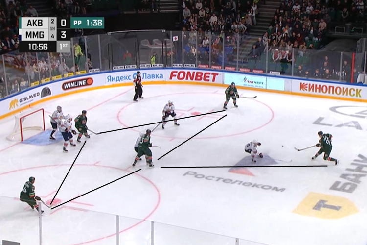 Начнём с простого: «Ак Барс» во всех матчах сезона играет в большинстве по схеме «зонтик». Называется она так по расположению игроков: если расчертить линии между хоккеистами, то выйдет зонтик. Это наиболее популярная схема в КХЛ, по которой играет большая часть команд. Что касается «конверта», ещё одной популярной схемы, то «Ак Барс» в него в этом сезоне не играл.