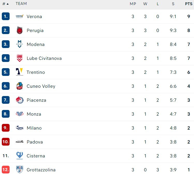 Еще никогда эта команда не была единоличным лидером турнира. Сейчас у команды Фабио Соли девять очков после трёх матчей – она на одно очко опережает «Перуджу», у которой также три победы. Остальные команды успели потерпеть минимум одно поражение.