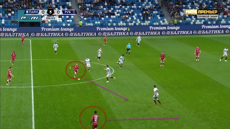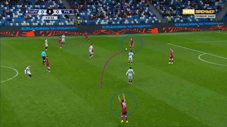 Успевал он и начинать атаки, что крайне важно в построении игры «Рубина». От центральных защитников всегда требуется хорошая первая передача на чужую половину соперника, чтобы мяч мог получить свободный партнер, либо Даку успешно поборолся. Вот, в одном из эпизодов Никита делает хорошую среднюю передачу верхом на Кабутова. При этом онграмотно разобрался в данном эпизоде, поскольку все рядом стоявшие партнеры были закрыты.