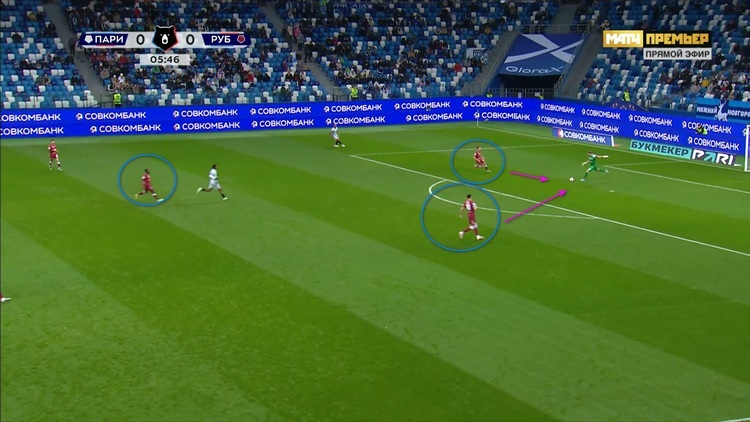 Вот, например, уже привычная картина, как казанцы высоко поднимаются, не давая соперникам легко разыгрывать мяч. Обычно это происходит после перерыва, когда надо менять ход матча, но тут это был уже в дебюте встречи. Давление на игроков «Нижнего» оказывалось специально, чтобы они не могли легко разыгрывать мяч возле своей штрафной, а закидывали его вперёд в борьбу, а это уже привычная игра «Рубина», в которой он хорош.