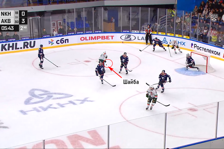 Не сказать, что драка помогла «Нефтехимику». Нижнекамцы то удалялись за нарушение численного состава, то просто теряли шайбу из виду. Посмотрите на скриншот ниже: четыре хоккеиста просто не видят шайбу и смотрят кто куда. Удивительно, как Биро не воспользовался моментом и не забил.