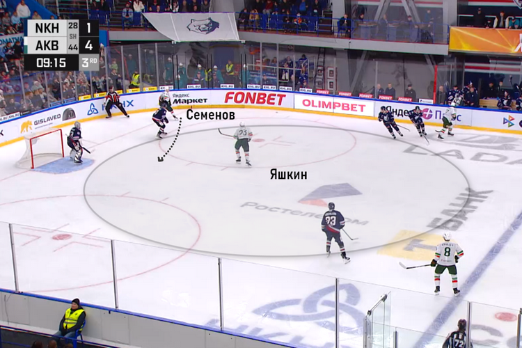 Яшкин и вовсе мог оформлять хет-трик – тоже с пятачка. Хоккеисты «Нефтехимика» просто забыли габаритного игрока, опекая других. На скриншоте ниже показан момент, как Яшкин стоит в одиночестве в нескольких метрах от ворот. В итоге нападающий «Ак Барса» Кирилл Семёнов отдал передачу партнеру, но тот не смог обыграть голкипера «Нефтехимика» Филиппа Долганова.