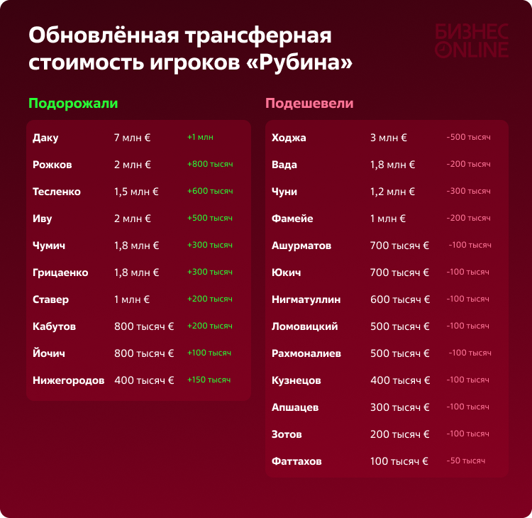 В большей степени игроки вообще не получали никаких новых расценок. Например, Велдин Ходжа, Богдан Йочич, Егор Тесленко.. Связано это и с тем, что «Рубин» не поднялся выше в турнирной таблице. «Балтика», например, которая забралась в турнирной таблице на пятое место, подорожала на 5 млн евро, но в общей сумме всё равно ниже «Рубина».