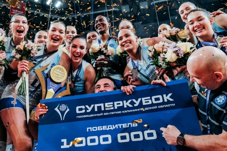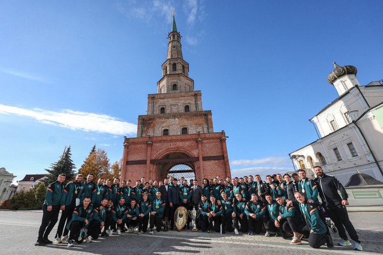 Кроме чемпионата, «Стрела» выиграла Кубок России и Суперкубок. Команда позирует с наградами на фоне башни Сююмбике.