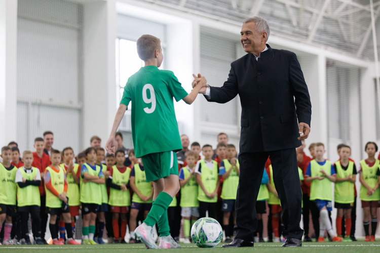 моРаис приветствует молодого футболиста «Рубина» на открытии манежа на клубной базе.