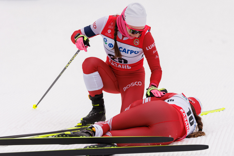 Наталья Терентьева после финиша проверяет свою младшую сестру Дарью Непряеву.