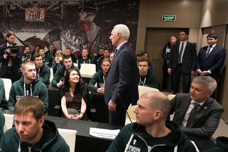 Рустам Минниханов здоровается с новым капитаном «Ак Барса» Кириллом Марченко.
