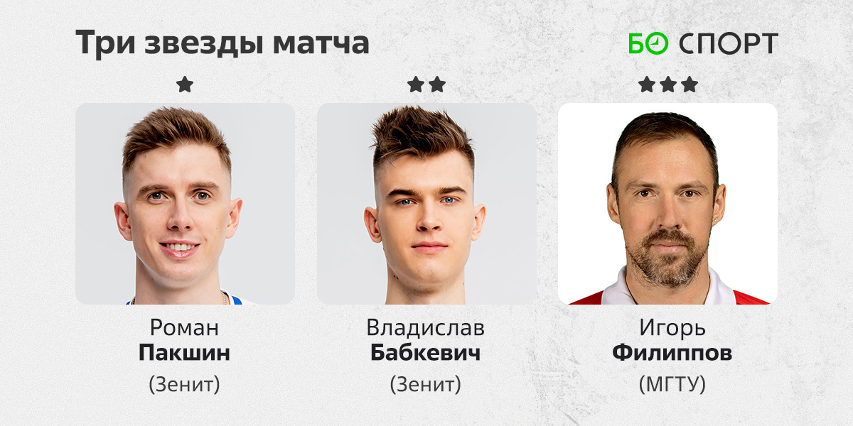 В составе «Зенита» по обыкновению лучшим бомбардиром стал Владислав Бабкевич (19 очков, +16), но первой звездой матча мы признаём Романа Пакшина. У него 70% позитивного приёма, 55% в атаке, один эйс и шесть блоков из 10 командных. 27-летний доигровщик ранее не набирал в «Зените» больше восьми очков, а тут сразу 18. Могло быть больше, но Пакшина трижды закрыл блоком Игорь Филиппов. Еще один раз он остановил атаку Максима Космина.