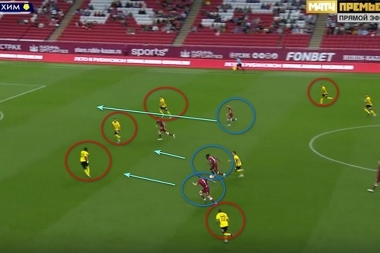 Можно вспомнить матч третьего тура чемпионата России против «Рубина» в Казани (скриншот выше). Тогда «Химки» тоже вышли с тремя центральными защитниками, а фланговые игроки поднимались слишком высоко. Так, одна из потерь в центре поля привела к обрезу и мяч оказался у казанцев. Они начали быструю контратаку, а крайние футболисты не успели вернуться назад. Благо для «Химок», что та ситуация не закончилась взятием ворот.