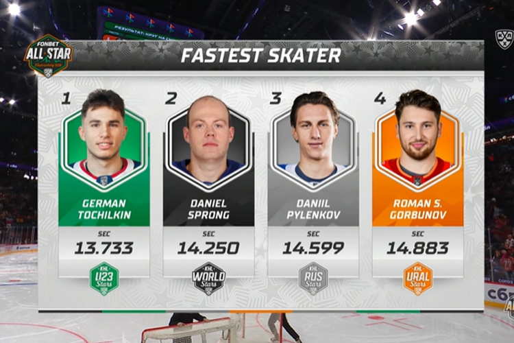 Первыми на лед вышли команды KHL U23 Stars и KHL World Stars (8:5). У сборной мира больше всех выделялся Даниэль Спронг из «Автомобилиста»: он забил первый гол, делал сумасшедшие рывки и занимал место вратаря, пока его команда выходила с пятым полевым.