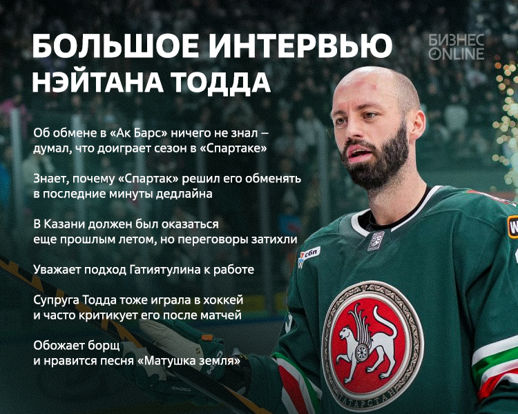 «Ак Барс» за несколько минут до конца дедлайна усилил состав звездным новичком – из «Спартака» был обменян Нэйтан Тодд, который на тот момент был лучшим бомбардиром московской команды. За казанский клуб 30-летний канадец провел четыре матча и уже отметился голом. А в интервью «БИЗНЕС Online» признался, что должен был оказаться в «Ак Барсе» еще прошлым летом: «И моя семья, и мой агент были уверены, что я буду играть в Казани».