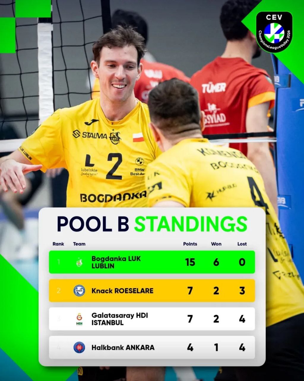 В Лиге чемпионов из трёх команд у Турции осталась лишь одна. А вот все четыре польские команды прошли в плей-офф. Помимо «Люблина», с первого места в группе в четвертьфинал попали волейболисты «Заверце». В своем квартете они обошли «Ресовию». Две команды из одной страны оказались в одной группе, поскольку одна из них получила wild card.