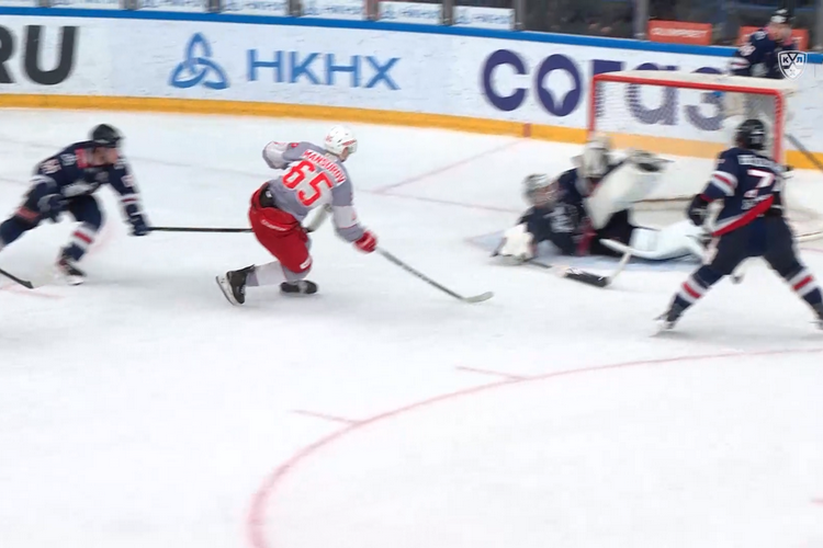 Что попробовал сделать форвард «Спартака» Данил Пивчулин? Занести шайбу в ворота. Однако на пути встал защитник «Нефтехимика» Максим Федотов – именно он первым спас команду. Однако момент на этом исчерпан не был. «Спартак» подобрал шайбу и нанёс бросок с трёх метров. Долганов, который толком не успел занять позицию, отбил шайбу в какой-то сумасшедшей позе.