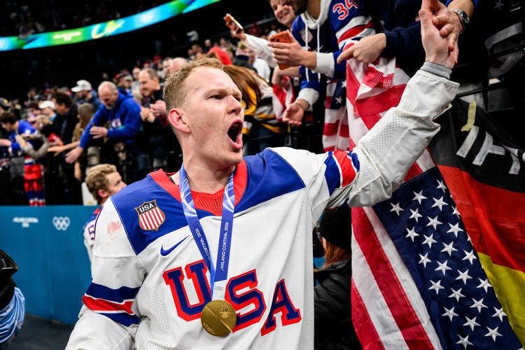 13. Отойдём ненадолго от церемонии и вспомним главные события Олимпиады. Несомненно, главное из них случилось в последний день игр – сборная США сенсационно обыграла Канаду (2:1 ОТ), которая привезла всех своих звёзд из НХЛ. Обе команды забивали по пять-шесть шайб на групповом этапе, но в этот же раз забили три шайбы на двоих. Последняя, как это должно быть в таких матчах, случилась в овертайме. Для США это первая победа на Олимпиаде в хоккее с 1980 года.