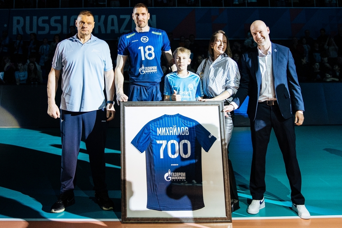 После игры состоялась церемония чествования 37-летнего диагонального, который проводит свой 16-й сезон в команде. И остаётся на 17-й – об этом официально объявили на всю арену. Алексей Вербов и Алекно вручили легендарному игроку майку с цифрой 700. А майку Михайлова с привычным 18-м номером подняли под своды Центра волейбола. Это был вопрос времени. В казанском клубе решили не дожидаться, когда Максим завершит карьеру и привязали чествование к его юбилейному матчу. Тем более, он пришёлся на знаковое зенитовское дерби, которое всегда вызывает повышенный зрительский интерес.