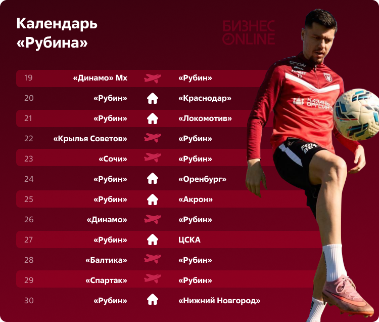 А дальше по календарю два домашних матча против топ-команд: «Краснодара» и «Локомотива». После них – дерби в Самаре и двухнедельная пауза на игры сборных. Нельзя сказать, что «Рубину» выпал простой календарь, ведь в середине весны будет отрезок матчей против «Динамо», ЦСКА, «Спартака», «Балтики» в Калининграде и, немаловажно, – матчи против команд, борющихся за выживание «Сочи» и «Оренбург». Про таких соперников обычно говорят: «Для них каждый матч как последний», но и «Рубину» очки терять тоже нельзя.