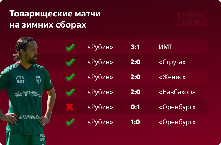 Важно отметить: у «Рубина» во время сборов сократилось количество матчей с девяти до семи. Матчи с «Кайратом» и «Борацем» были отменены по решению сторон. Артига эти проблемы компенсировал дополнительными тактическими тренировками, а для поддержания физической нагрузки матчи с «Женисом» и «Навбахором» были сыграны по 120 минут.