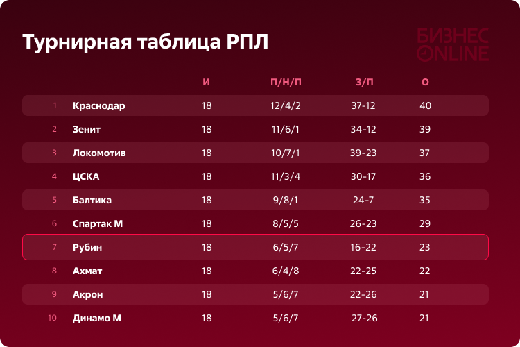 А снизу «Рубин» крепко подпирают «Ахмат», «Акрон» и «Динамо». Грозненцы на 8-й строчке с 22 очками, отставая от «Рубина» всего на один балл. Команду Станислава Черчесова, как и «Рубин», осенью тоже штормило – шесть матчей без побед, но чтобы исправить нестабильность и увеличить конкуренцию, в зимнее трансферное окно клуб сделал 8 приобретений. При этом публично никто не высказывался о задачах клубах, хотя до старта сезона сообщалась о целях попасть в пятерку.