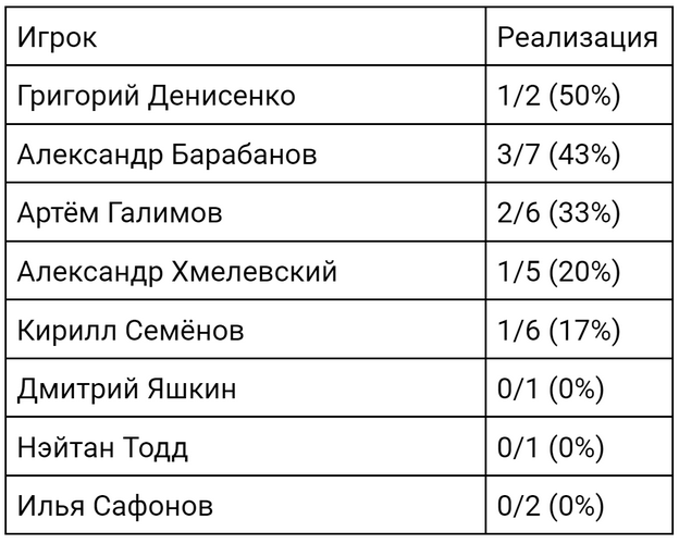 Ради интереса, мы посмотрели, кто из игроков «Ак Барса» лучше всех исполняет буллиты. Чаще тренерский штаб отправляет на заключительные броски Александра Барабанова (семь попыток), самый высокий процент реализации – у Григория Денисенко (50%), но он всего два раза выходил на пробитие.
