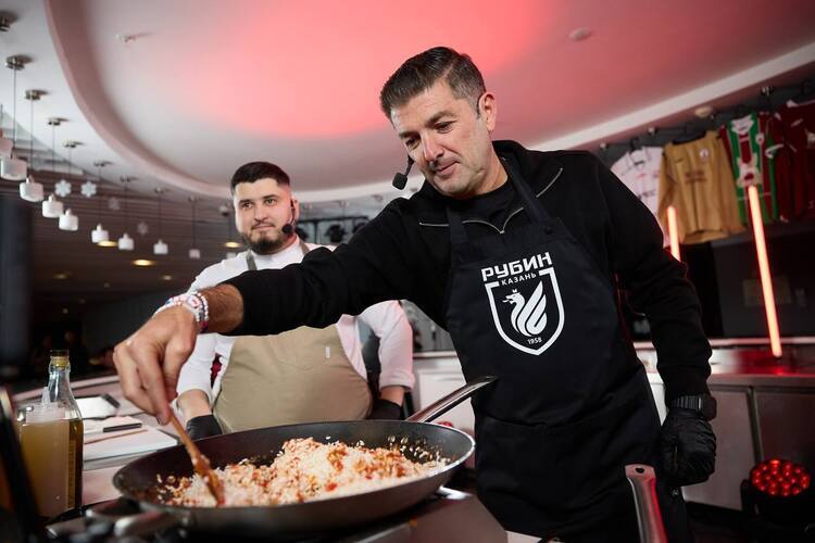 В центре зала организовали целое место для готовки еды. Заправлял всем бренд-шеф казанских ресторанов Эльдар Хахоков, а помогал ему Артига. Сам испанец облачился в брендированный поварской фартук. Давно известно, что Франк любитель приготовить поесть. Такую практику он применял в своих прошлых командах. Делал он это для сплочения коллектива. Теперь этот же трюк он провернул и с болельщиками, чтобы расположить их к себе. А приготовили они – паэлью – блюдо испанской кухни.
