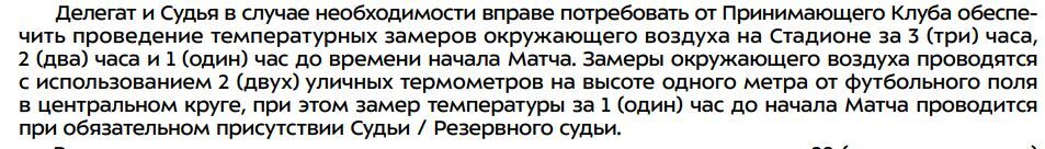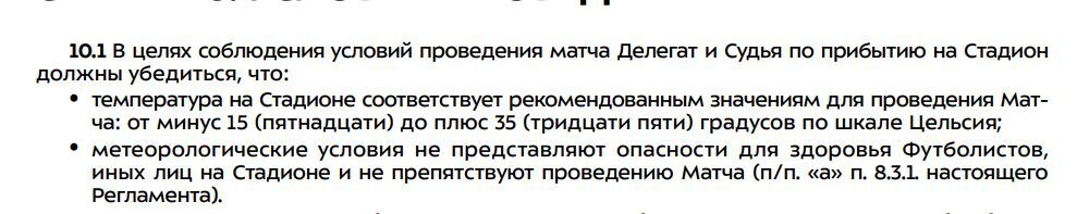 Теперь всё отдано на откуп главному арбитру встречи Сергею Карасёву. Видимо, не случайно на эту игру назначили самого опытного и именитого судью РПЛ. За час до игры главный судья матча решает о целесообразности проведения встречи – так написано в регламенте. Также там написано, что матч должен быть перенесён при температуре –15 градусов. согласно пункту 10.1.