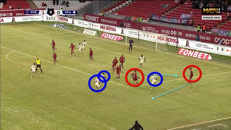 В концовке первого тайма казанцы прервали атаку краснодарцев. Рожков не смог толком вынести мяч, и он оказался у Грипши. Назми побежали накрывать сразу три игрока гостей, но не стал выбивать мяч в аут или на угловой, а хладнокровно вернулся с ним обратно в штрафную и спокойно нашел короткой передачей Рожкова. Илья не стоял столбом, а правильно сместился под пас и уже сам спокойно вывел мяч. Идеальный выход из ситуации.