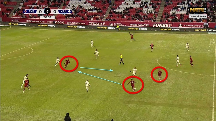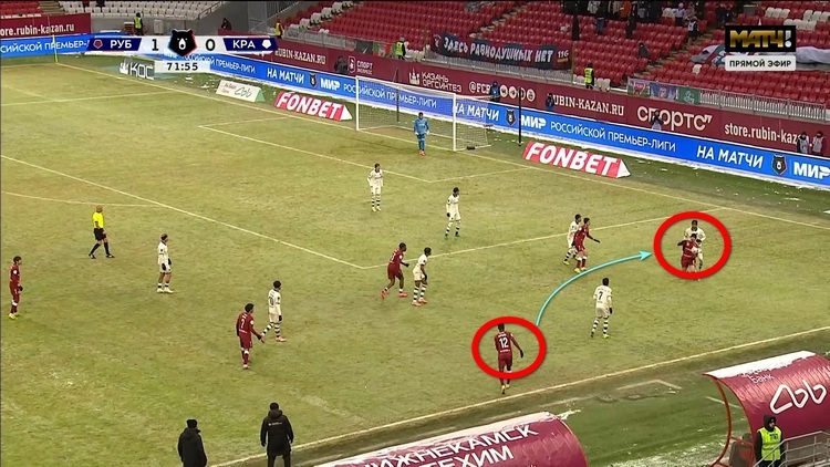 Вот пример. Илья Рожков вбросил мяч из аута на Велдина Ходжу, Велдин развернул атаку из центра на правый фланг на Андерсона Арройо, колумбиец не смог далеко пройти с мячом, но не стал пихать его дальше по флангу, а спокойно развернулся и вернул его Денилю Мальдонадо, а тот пошел в обводку. Когда вообще такое можно было увидеть от центрального защитника у «Рубина»? Дальше перепасовка продолжилась, никаких дальних забросов. До удара не дошло, но «Рубин» закрутил карусель по новой и развернул мяч на другой фланг.