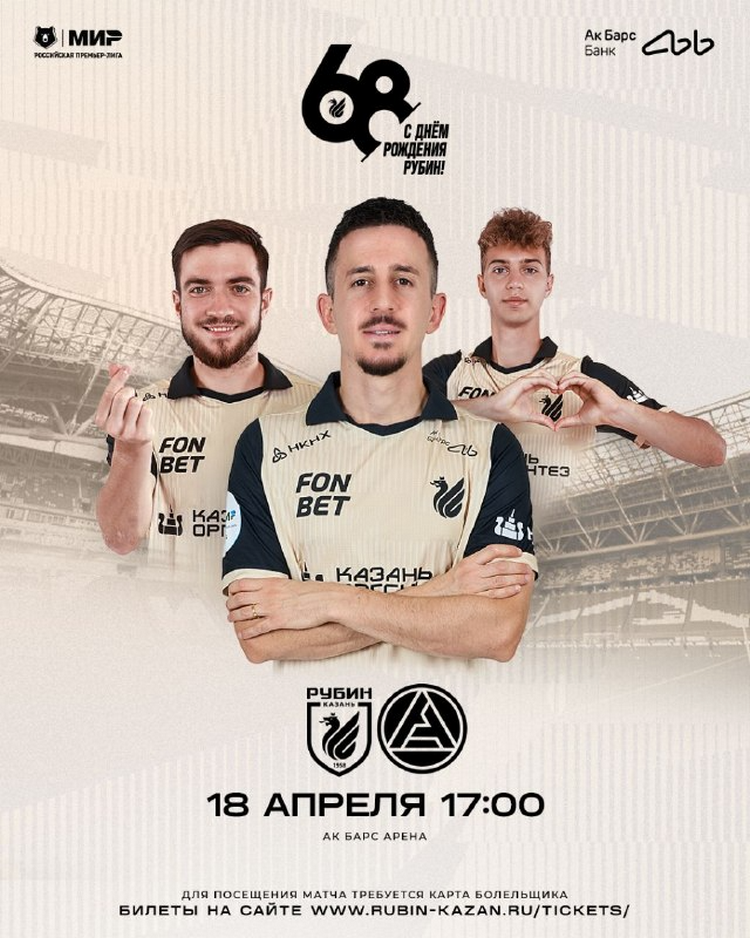 18 апреля «Рубин» проведёт на «Ак Барс Арене» матч 25-го тура чемпионата России по футболу против тольяттинского «Акрона», который начнётся в 17:00.