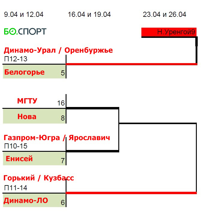 Напомним, что три пары команд («Кузбасс» – «Горький», «Оренбуржье» – «Динамо-Урал», «Ярославич» – «Газпром-Югра») уже провели первые матчи в своих противостояниях. Ответные состоятся 5 апреля.