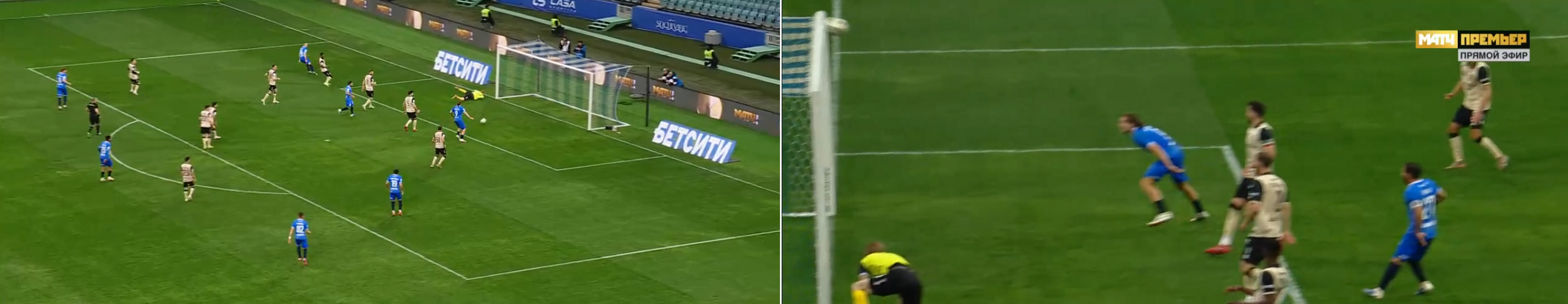 Начо показал проблеск гениальности: отдал шикарный пас верхом в свободную зону на Арройо в полуфланг. Колумбиец получил большое пространство и беспрепятственно прострелил в штрафную. На дальней штанге забегал Руслан Безруков. Именно из той зоны, где должен был быть Заика – партнёр его не подстраховал и Безруков замкнул подачу – 1:0.