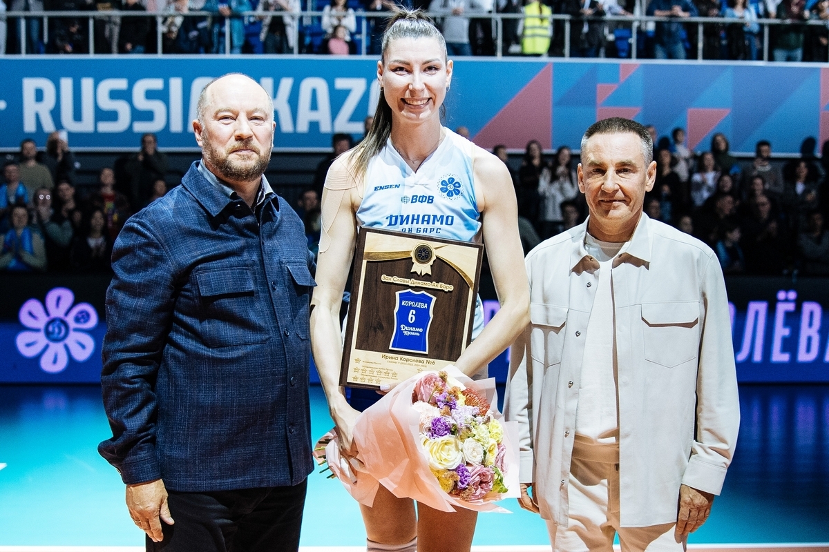 После финального свистка ведущий настойчиво просил зрителей оставаться на своих местах. И не просто для традиционного приветствия команды. После 2–0 в серии стало понятно, что «Динамо-Ак Барс» в этом сезоне может больше не сыграть на домашней площадке. Между тем еще в середине сезона появилась информация, что 34-летняя блокирующая Ирина Королёва планирует взять паузу в карьере. В казанском клубе решили, что сейчас лучший момент для её чествования. Майку Королёвой с шестым номером подняли под своды Центра волейбола. Ранее подобной чести были удостоены Екатерина Гамова, Джордан Ларсон, Екатерина Кабешова и Евгения Старцева.