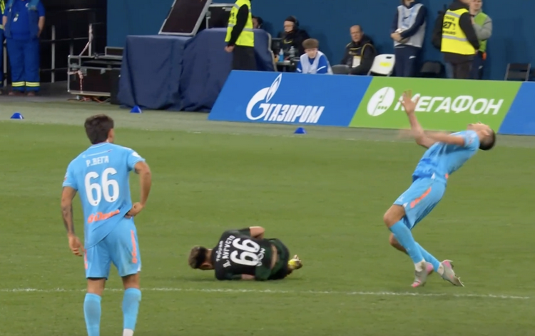 А перед самым финальным свистком игрок выдал настоящее моноспектакль собственного исполнения. Ситуация произошла в центре поля: Соболев боролся с Ленини и решил упасть. Уже из лежачего положения он зачем-то поставил подножку, проходившему рядом Дугласу Аугусто.