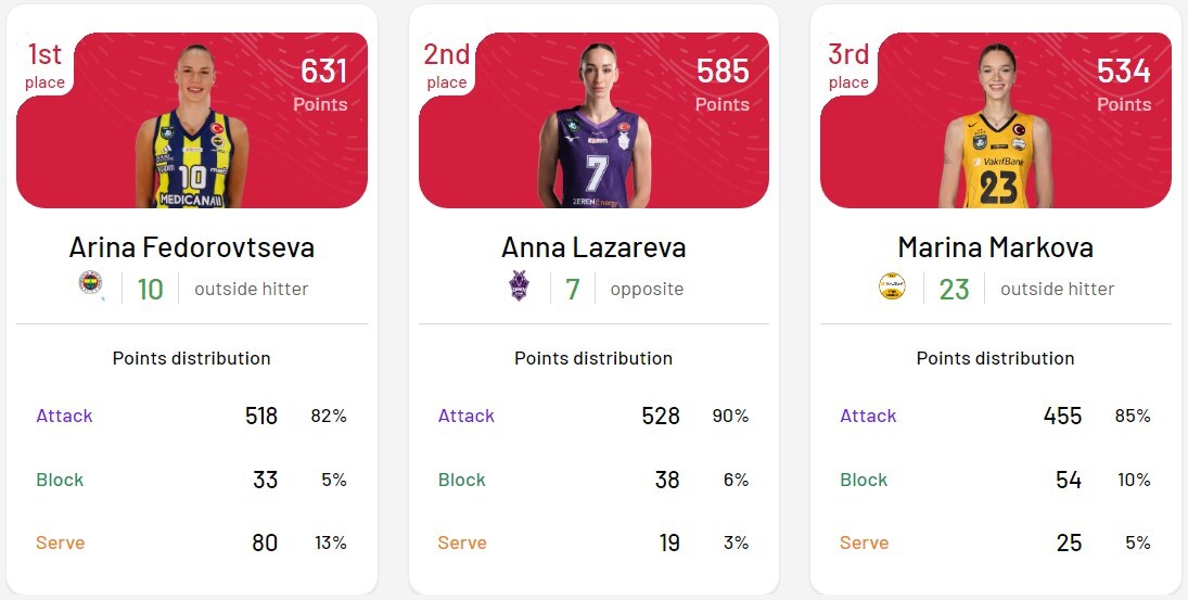 Маркова стала третьим бомбардиром турецкой лиги с учётом регулярного чемпионата и плей-офф. Больше очков только у Федоровцевой и диагональный Анны Лазаревой из «Зерена». Как же хочется увидеть сборную России в официальных турнирах, где Маркова и Федоровцева будут уже не соперницами, а напарницами по доигровке.