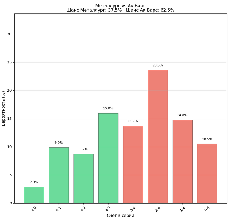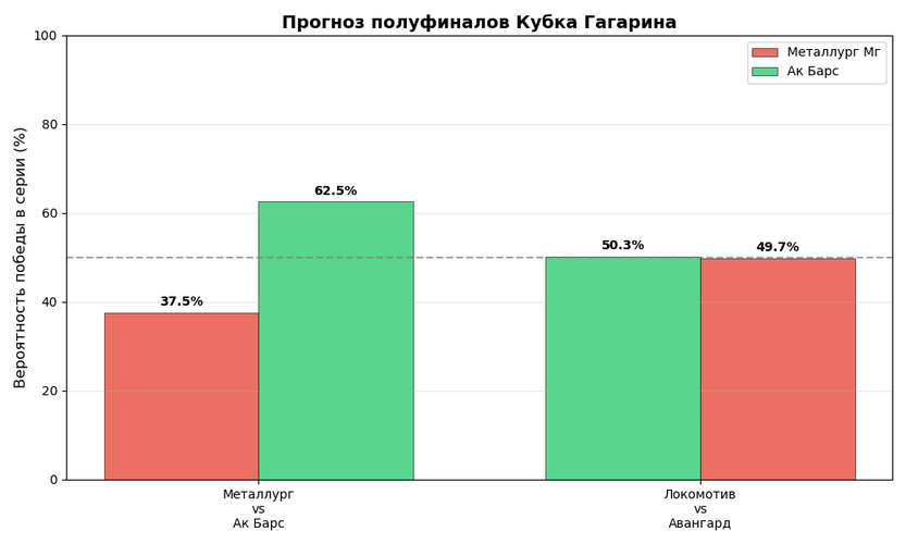 Начнём с того, что «Металлург» имел самую простую сетку среди всех полуфиналистов. «Сибирь» смогла зацепиться лишь за один матч, и то в овертайме, а «Торпедо» в целом мало кто ожидал увидеть во втором раунде. «Ак Барс» в то же время прошёл «Трактор», который набрал ход перед плей-офф, и минское «Динамо», которое весь сезон входило в число претендентов на Кубок. Этим и объясняется прогноз модели: «Ак Барс» знает, как проходить топ-соперников, а вот «Металлург» – нет.