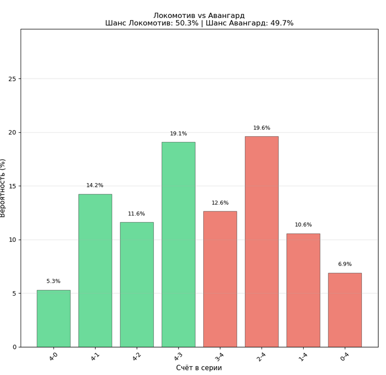 Наверное, поэтому «Локомотив» в среднем чаще побеждает «Авангард» в серии (на 0,6%), однако самый популярный исход – победа «Авангарда» в шести матчах. Означает это одно: серия обещает быть максимально ровной, то есть такой же, что и год назад. Тогда соперники встретились во втором раунде: «Локомотив» выиграл лишь в овертайме седьмого матча, а потом не испытал проблем ни в полуфинале, ни в финале.