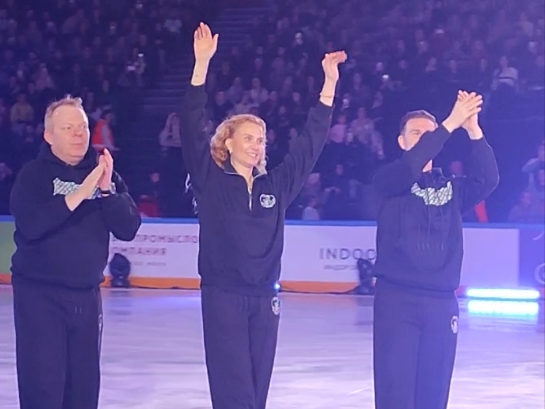 В конце шоу вышла сама Тутберидзе со своими помощниками Сергеем Дудаковым и Даниилом Глейхенгаузом.
