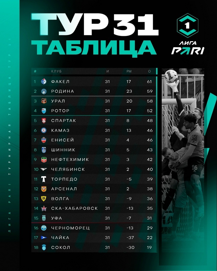 В первенстве Первой лиги завершился 31-й тур. «Родина» одержала тяжелую победу нал «Уфой», «Урал» устоял в дерби с «Челябинском», а КАМАЗ сумел выиграть второй матч подряд впервые с ноября.